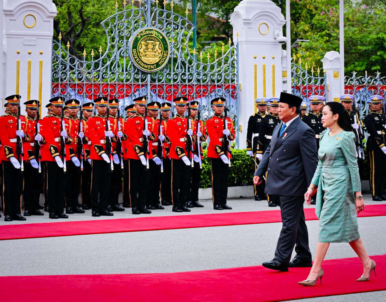 Presiden Prabowo tiba di halaman depan Gedung Thai Khu Fah dan disambut langsung oleh PM Paetongtarn. Upacara penyambutan resmi diawali dengan pengumandangan lagu kebangsaan Indonesia Raya dan lagu kebangsaan Thailand, menciptakan suasana khidmat yang mencerminkan saling menghormati antarnegara.