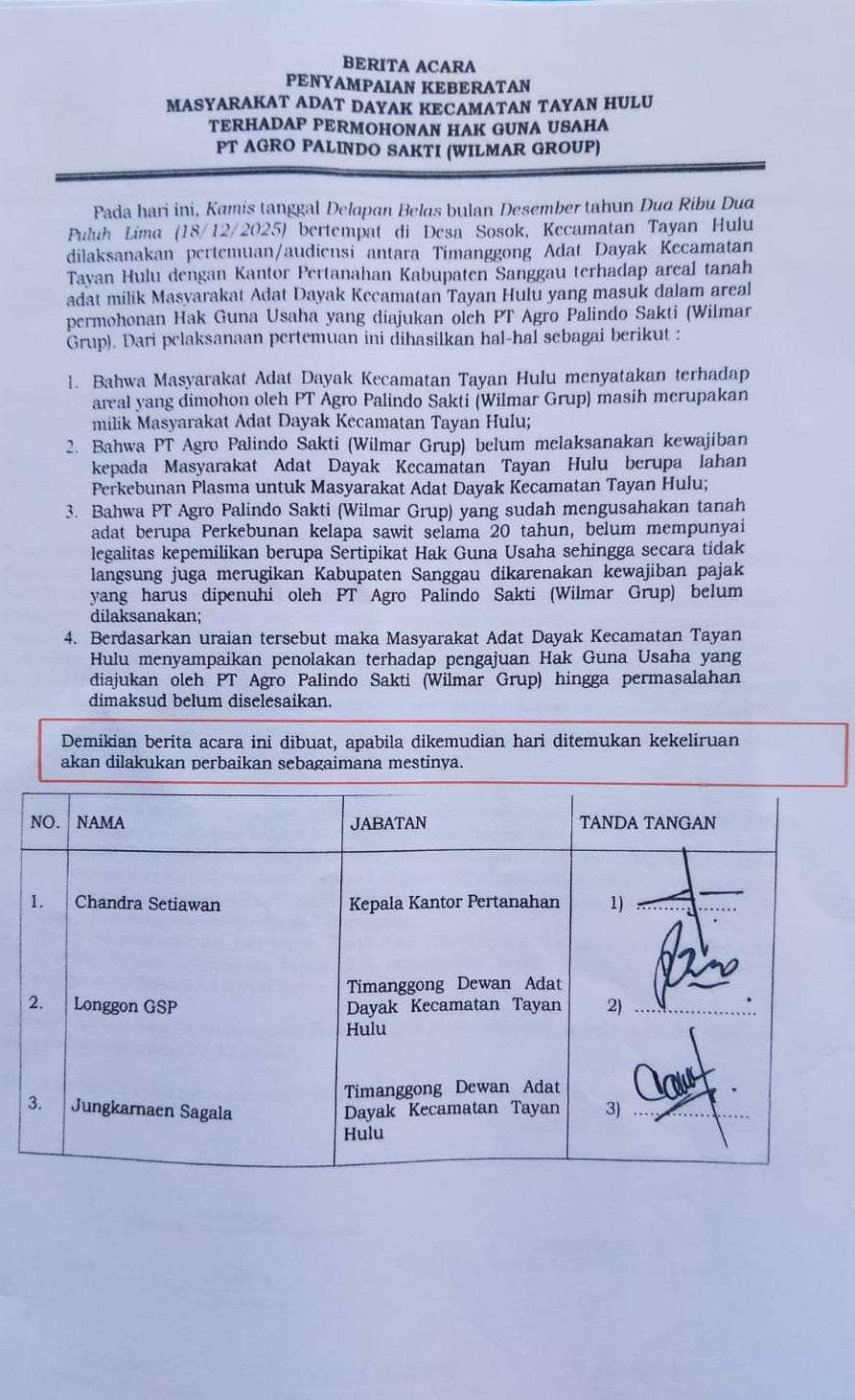 Perusahaan perkebunan sawit wilmar grup itu telah mengelola tanah adat Dayak Peruwan 20 tahun tanpa HGU.